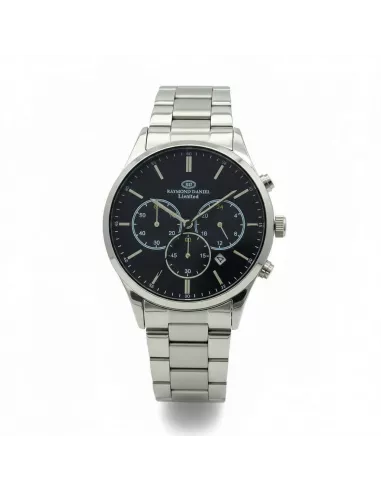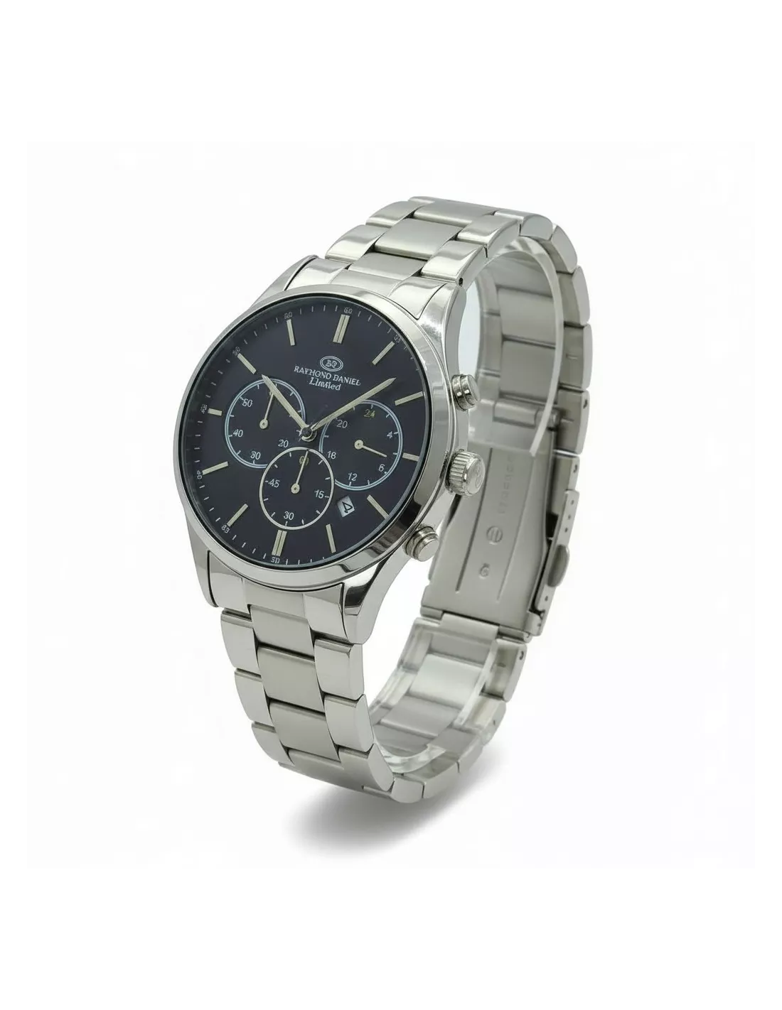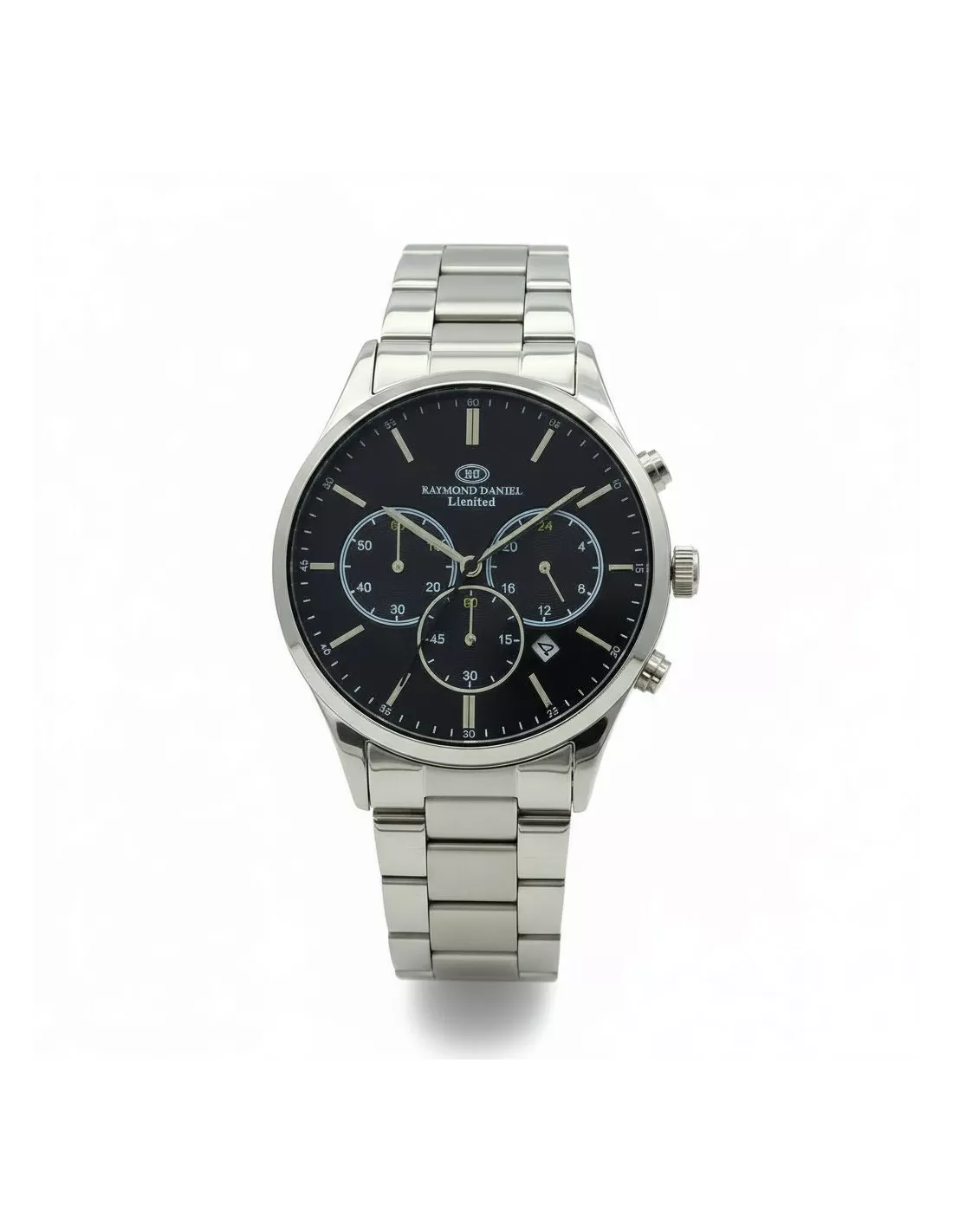 Montre Raymond Daniel Limited pour homme, un chronographe élégant avec un boîtier et un bracelet en acier inoxydable. Son cadran noir est doté de trois sous-cadrans et d'un guichet de date, offrant une fonctionnalité exceptionnelle.