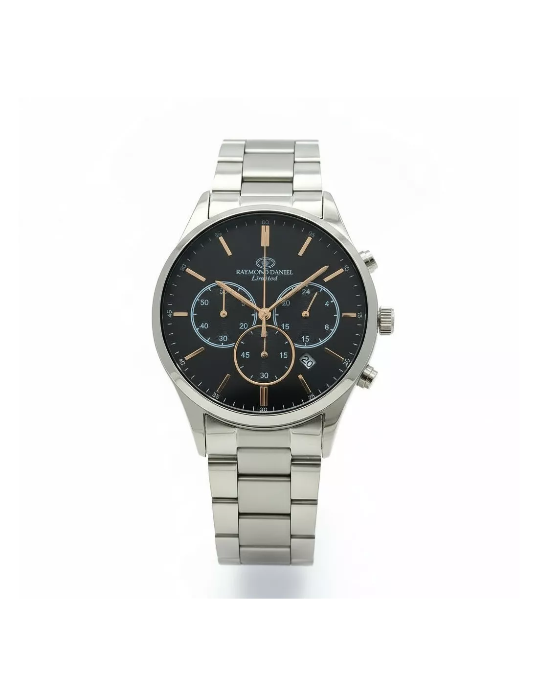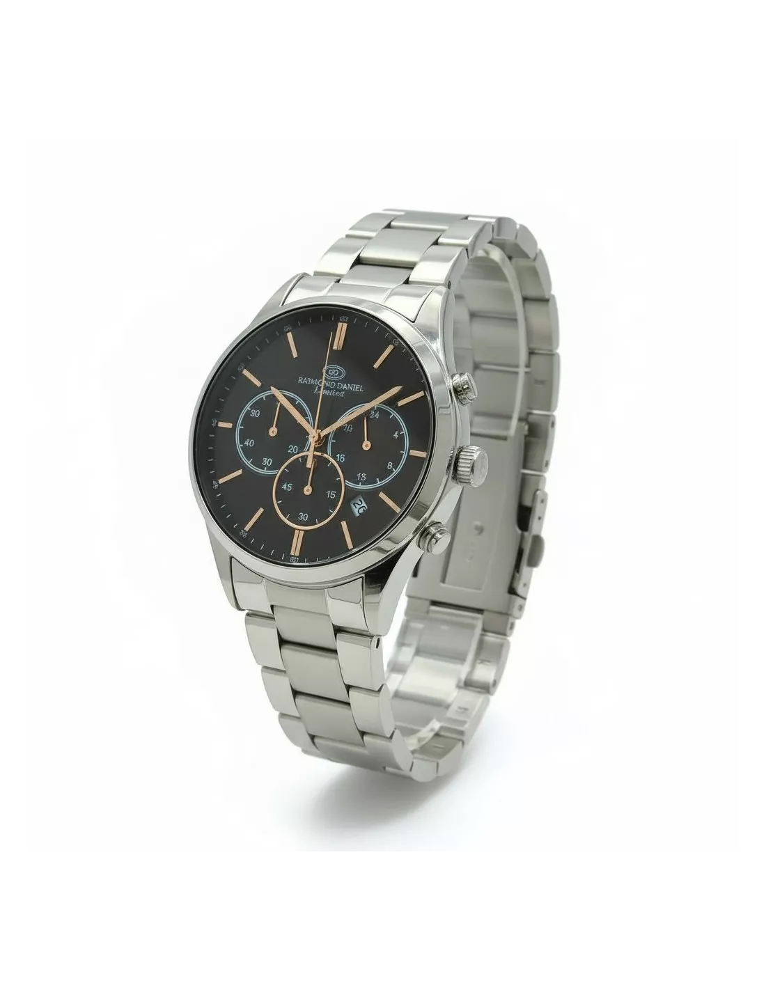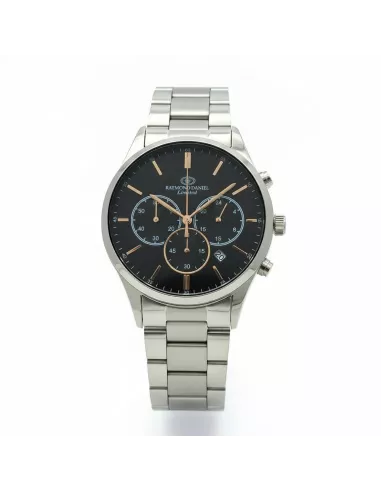 Montre Raymond Daniel Limited pour homme, un chronographe élégant avec un boîtier et un bracelet en acier inoxydable. Son cadran Noir est doté de trois sous-cadrans et d'un guichet de date, offrant une fonctionnalité exceptionnelle.
