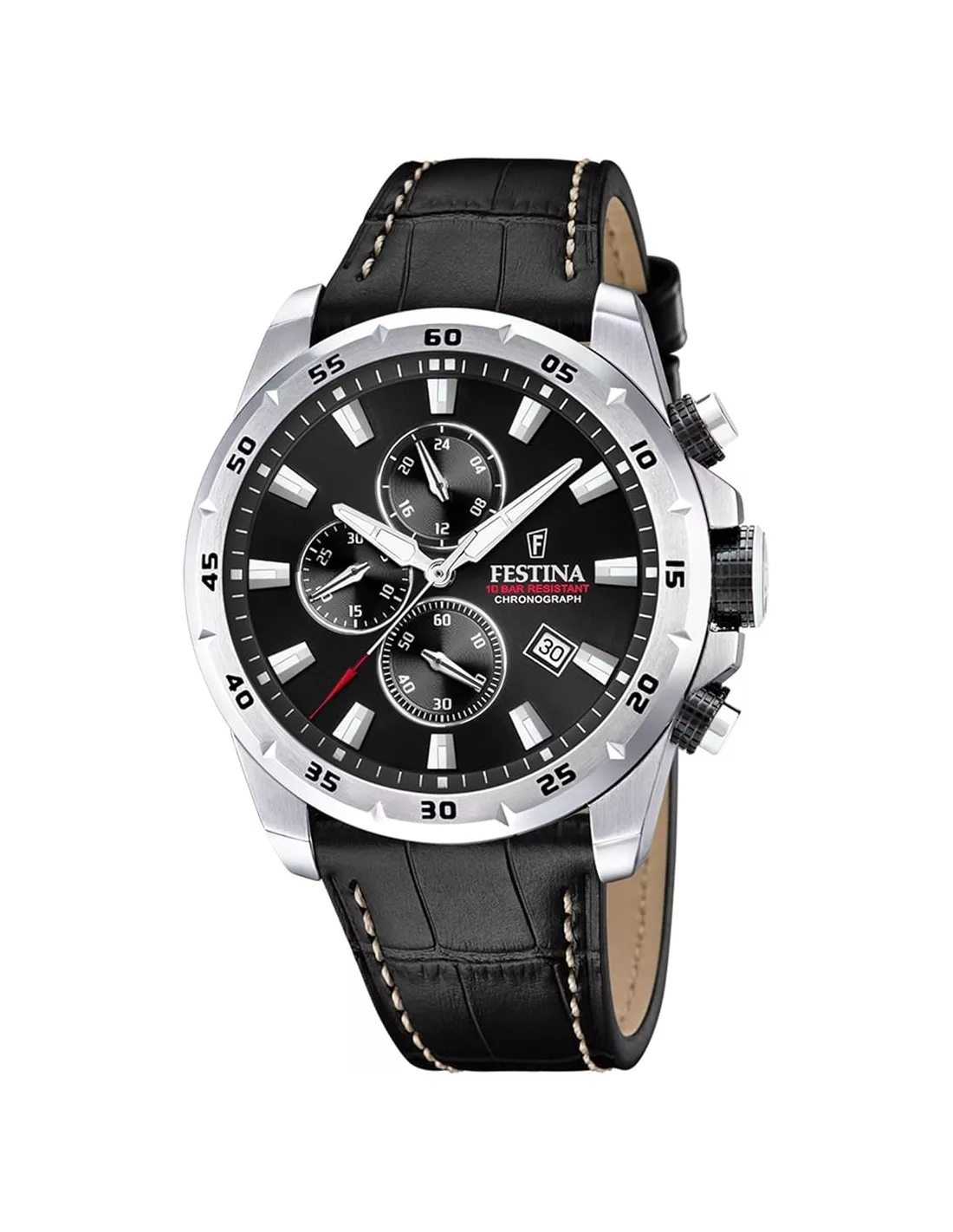 La Montre Homme Festina F20692/4 est le chronographe d'action dans sa version la plus classique. Son boîtier en acier brossé et sa lunette sportive entourent un cadran noir profond très contrasté. Le bracelet en cuir noir façon crocodile apporte une touche de luxe discret. Avec une résistance à l'eau de 10 ATM, cette montre est un choix puissant, fiable et élégant, parfait pour toutes les situations.