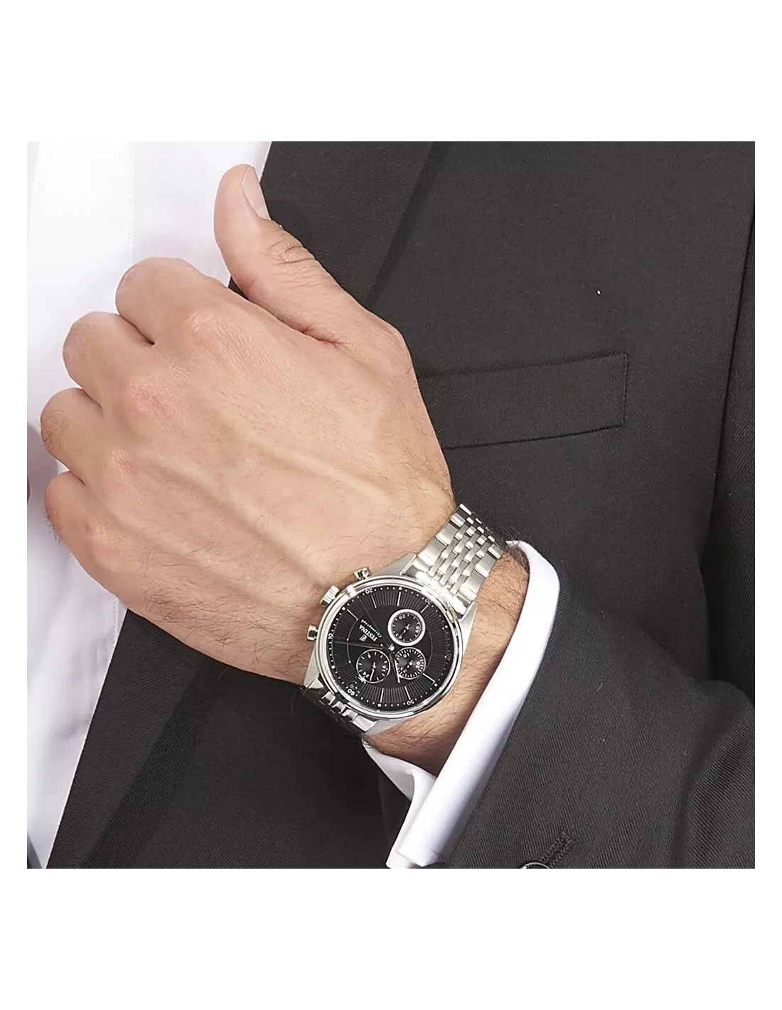 Montre chronographe quartz pour homme. Boîtier round de acier inoxydable, couleur gris. Bracelet de acier inoxydable, couleur gris, avec fermeture déployante. Cadran round en couleur noir en verre minéral. Résistance à l'eau: 20 atm.