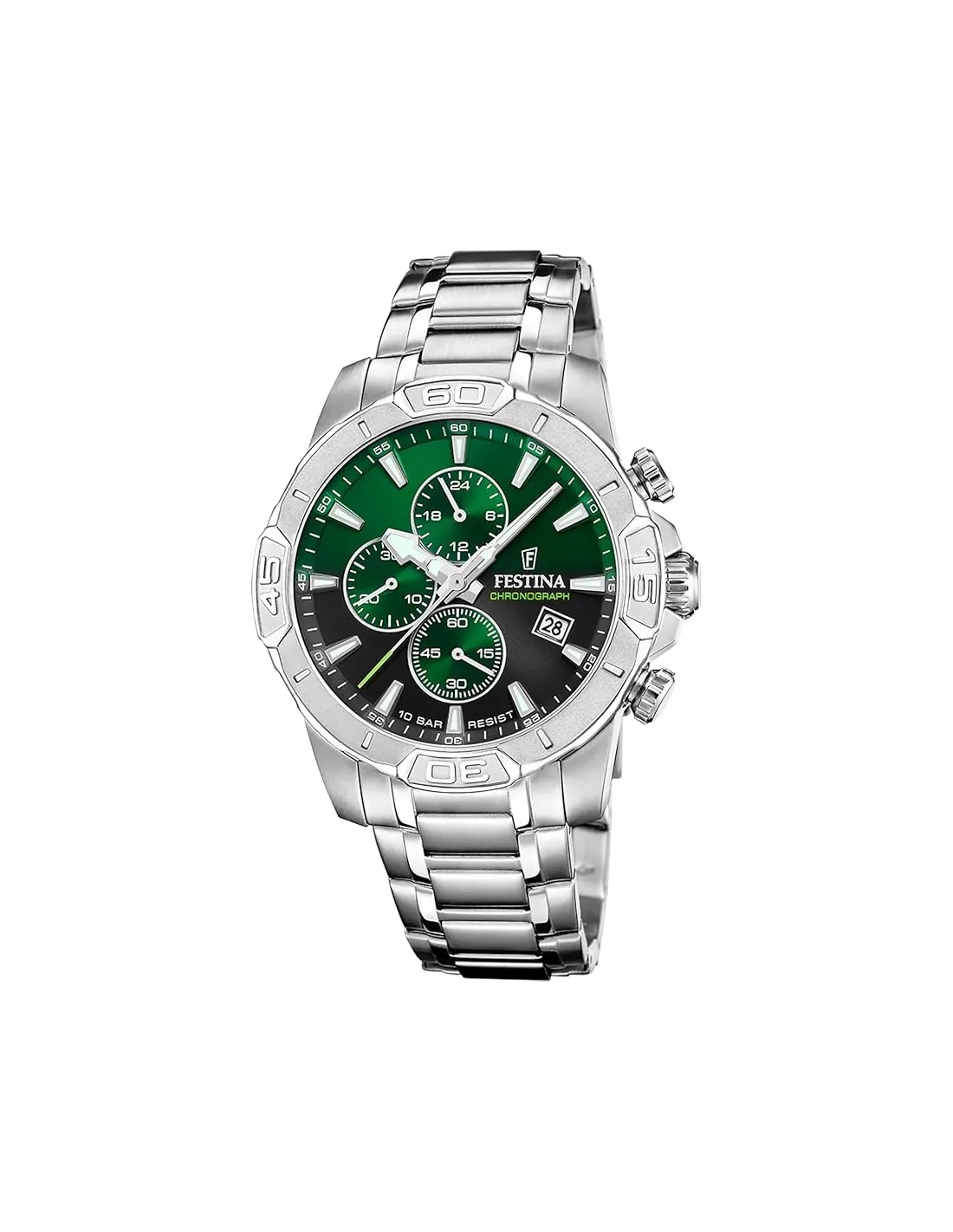 Cette montre Festina à un boîtier en acier inoxydable avec un diamètre de 42mm et possède un bracelet en métal. Le boîtier de la montre contient un mouvement chronographe à quartz de haute qualité et un cristal minéral.La montre est étanche à 5ATM. Cela signifie que la montre est étanche pour la douche. La montre est livrée avec 2 années de garantie...