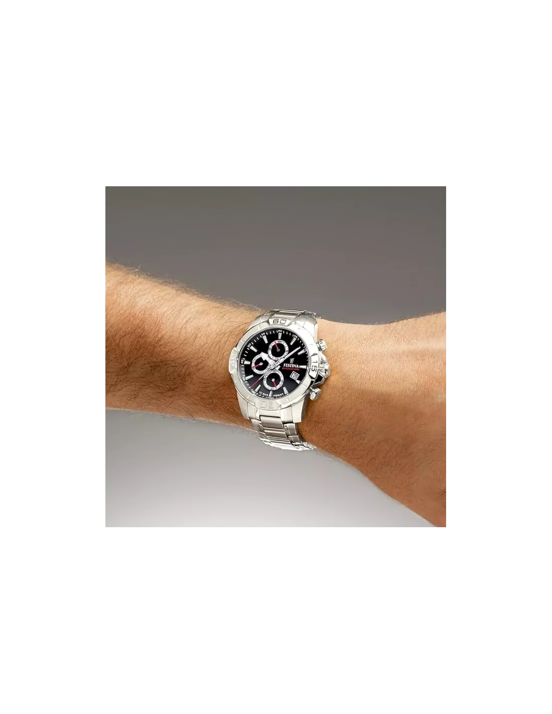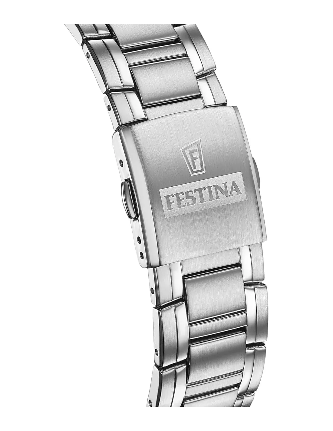 Cette montre Festina à un boîtier en acier inoxydable avec un diamètre de 42mm et possède un bracelet en métal. Le boîtier de la montre contient un mouvement chronographe à quartz de haute qualité et un cristal minéral.La montre est étanche à 5ATM. Cela signifie que la montre est étanche pour la douche. La montre est livrée avec 2 années de garantie...