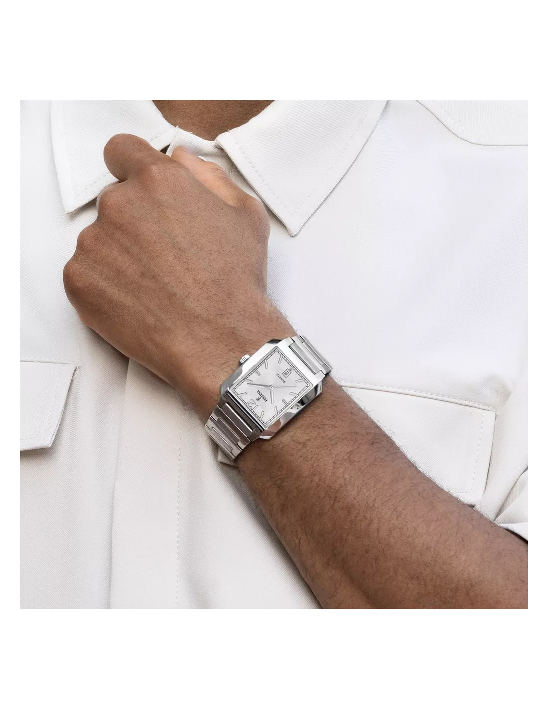 Le boîtier rectangulaire et robuste est entièrement réalisé en acier inoxydable, avec une combinaison de finitions polies (sur les angles) et brossées (sur les surfaces plates) pour accentuer sa structure. Le cadran blanc est la toile de fond parfaite pour les chiffres romains audacieux et stylisés qui encadrent la lecture du temps.