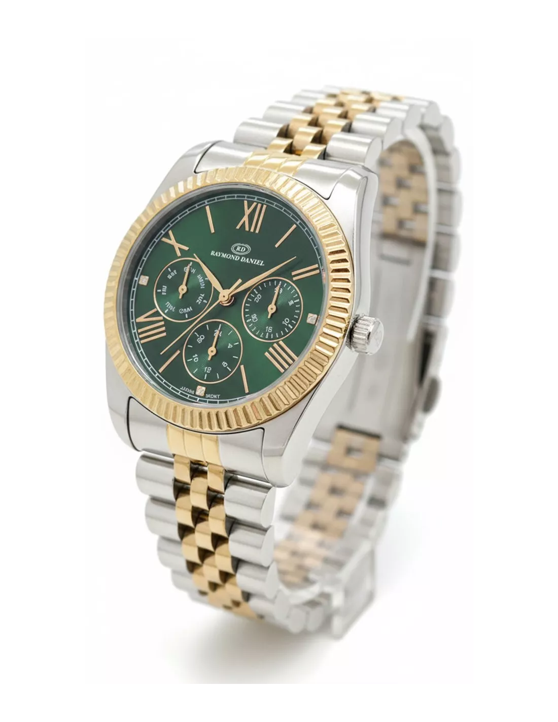 Caractéristique Détail Marque RAYMOND DANIEL Référence RD013024M-E Genre Femme Mouvement Quartz (à pile) Affichage Analogique Forme du Boîtier Rond Diamètre du Boîtier 35 mm (Taille standard femme) Matière du Boîtier Acier inoxydable Matière du Bracelet Acier inoxydable Couleur Dominante (Boîtier & Bracelet) Doré - Argent Couleur du Cadran Vert Étanchéité Faible résistance (Utilisation quotidienne : éclaboussures) Verre Minéral Garantie 1 an