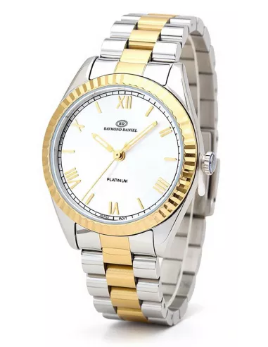 Caractéristique Détail Marque RAYMOND DANIEL Référence RD013016-C Genre Femme Mouvement Quartz (à pile) Affichage Analogique Forme du Boîtier Rond Diamètre du Boîtier 36 mm (Taille standard femme) Matière du Boîtier Acier inoxydable Matière du Bracelet Acier inoxydable Couleur Dominante (Boîtier & Bracelet) Doré - Argent Couleur du Cadran Argent Étanchéité Faible résistance (Utilisation quotidienne : éclaboussures) Verre Minéral Garantie 1 an